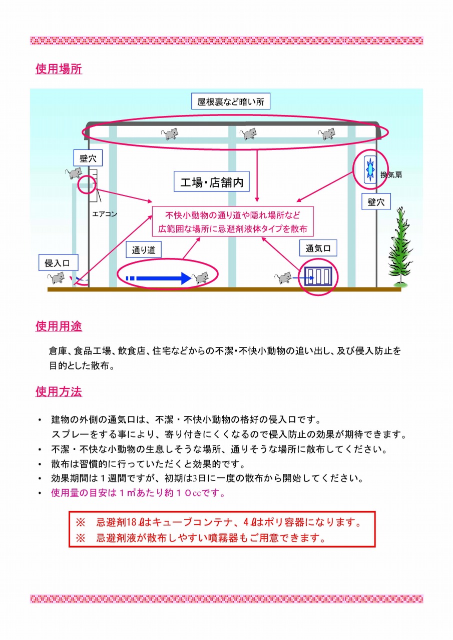 • 不潔・不快な小動物の生息しそうな場所、通りそうな場所に散布してください。