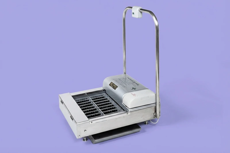 粘着ローラー式の衣類・体表面異物除去機。入室前の異物対策として使用します。