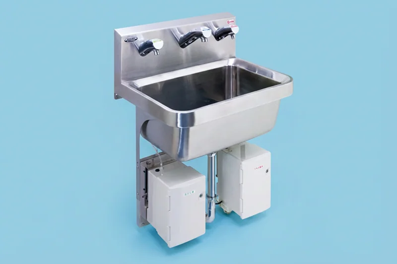 壁付型自動手指洗浄消毒器。石けん・水・消毒液を一台で自動供給します。