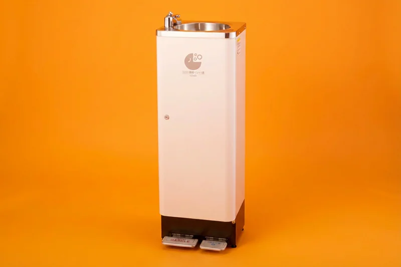 フットペダル式自動うがい器。手を触れずに操作できる衛生的なうがい・手洗い一体型ユニットです。